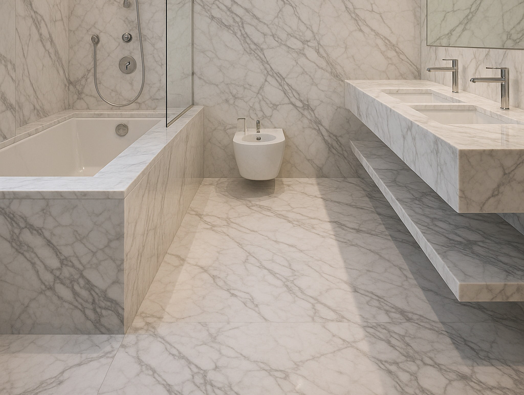 Associé à des teintes naturelles, du bois clair ou des éléments métalliques discrets, le marbre blanc s’impose comme un choix intemporel.