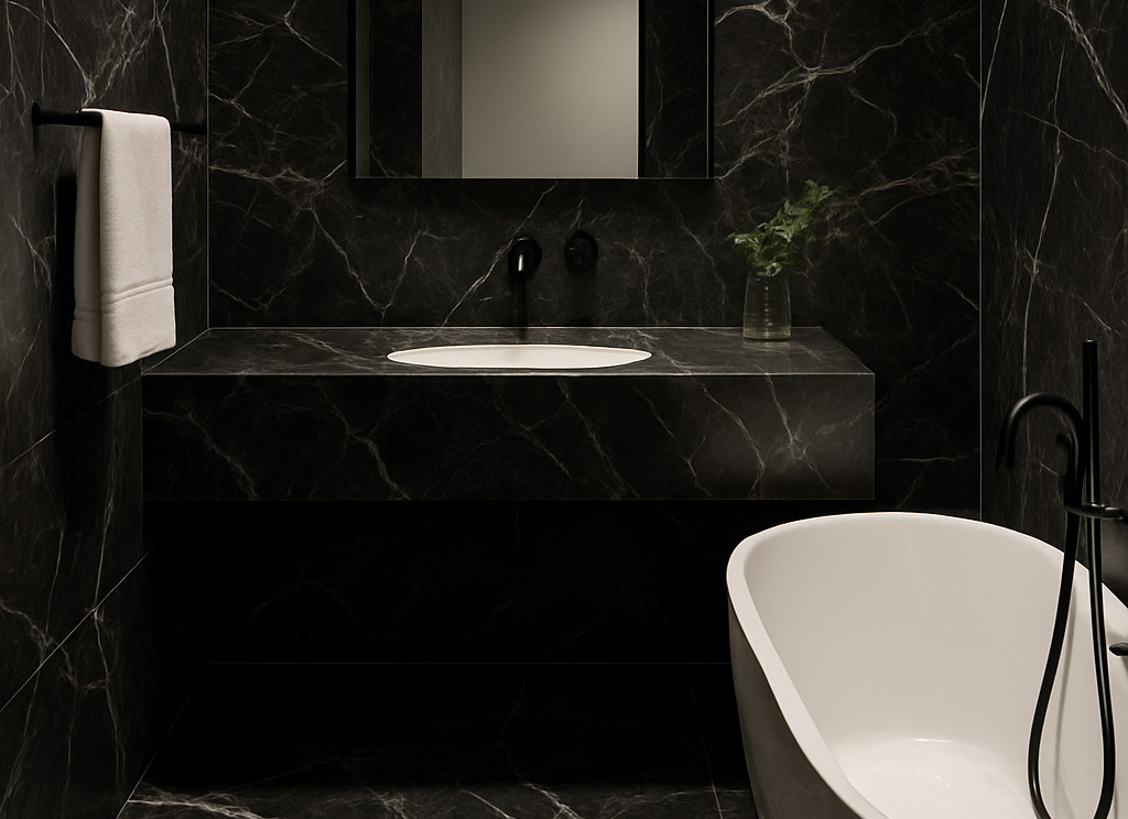 Le marbre noir se marie merveilleusement avec des matériaux clairs ou chaleureux : bois blond, laiton, acier brossé, ou même béton ciré. Il incarne le luxe moderne et donne à chaque espace une allure plus structurée, mature et affirmée.